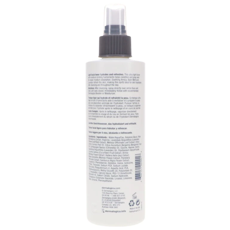 Humectants in this toner work to seal moisture into skin. After cleansing with PreCleanse and a cleanser formulated for your skin type or concerns, spray toner onto face and neck. Follow with the right Dermalogica moisturizer for your skin. This treatment is also helpful for re-hydrating on the go. A gluten-free, cruelty-free and vegan formula is made without parabens or artificial fragrances and colors.