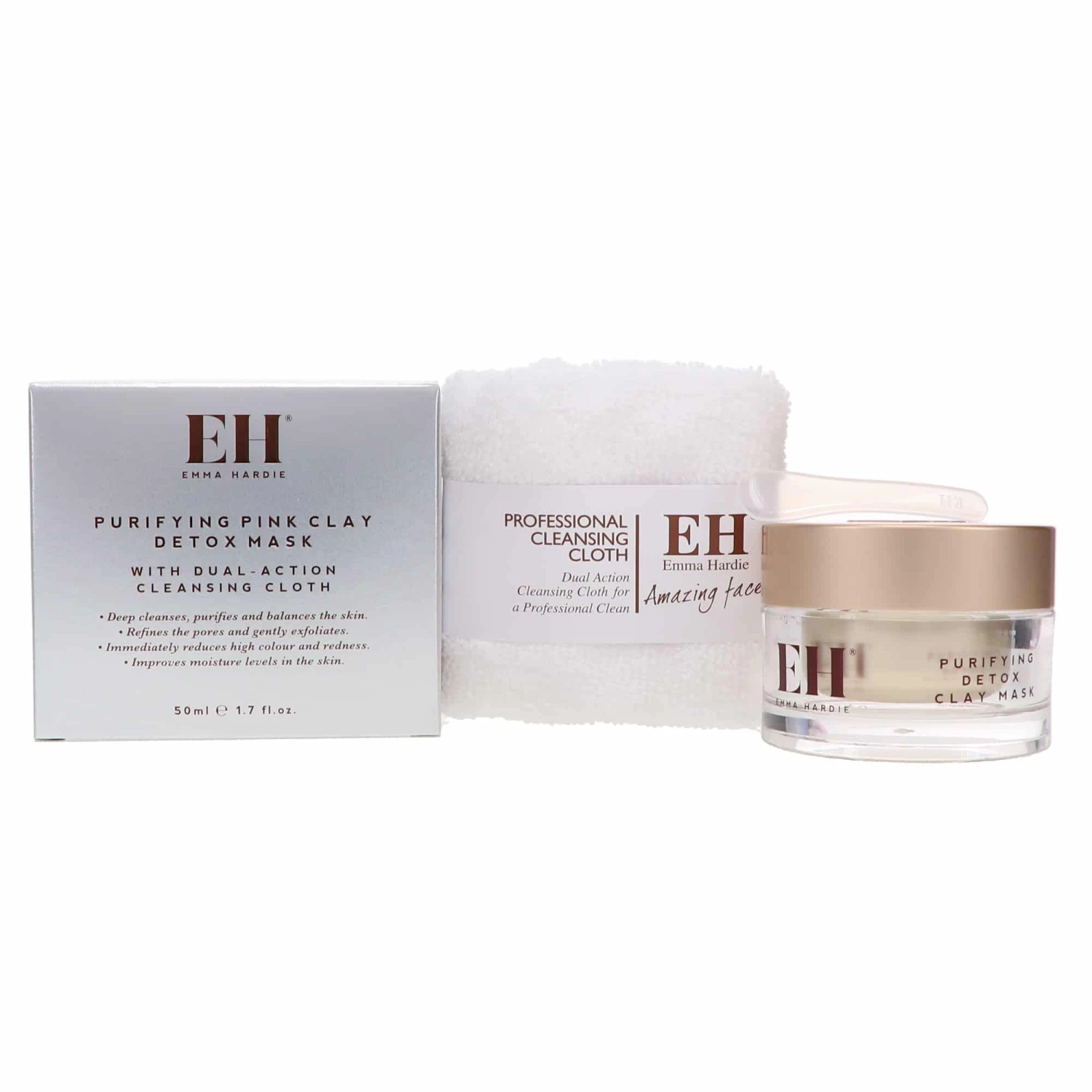 Emma Hardie Purifying Pink Clay Detox Mask exfoliates your skin and purifies and unclog your pores. Australian Pink Clay is a key ingredient in this high-quality mask. The Pink Clay, combined with botanicals to deliver many important benefits to your skin. Your skin will gain increased natural moisture levels, reduces redness and inflammation. Moringa seed oil is a vitamin-rich ingredient and another key to the formulation, as it provides antioxidant protection from vitamins C and E. The product comes with a dual-action cleansing cloth to help achieve an effective deep cleanse and balance your skin.