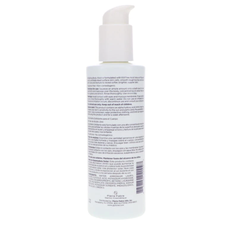 | How To Apply | Squeeze an ample amount onto a bath pouf or wet washcloth and massage over the entire body, working into a rich lather. Use once a day, or as directed by your physician. Concentrate on areas of the body that are the roughest and driest. Rinse thoroughly. For optimal results, follow with Glytone Exfoliating Body Lotion. |
