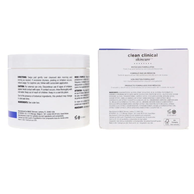 Image Skincare Clear Cell Salicylic Clarifying Pads is a salicylic acid based toner that nourishes the skin with herbal extracts of ivy, green tea, and tea tree while gently removing oil from the skin. Excess oil clogs pores to reduce circulation and allows bacterial growth, causing acne. This is caused by overactive glands. Clear Cell Salicylic Clarifying Toner corrects this problem by preventing acne at its source by removing excess oil, thus inhibiting the acne-causing action of bacteria. Image Skincare furthers its mission of helping the world to Age Later by consistently producing the latest anti-aging, hydrating, balancing and illuminating technologies and by being the most innovative brand in the industry.
