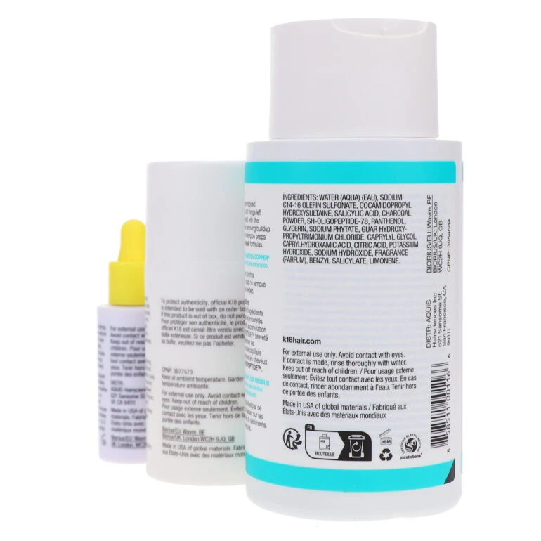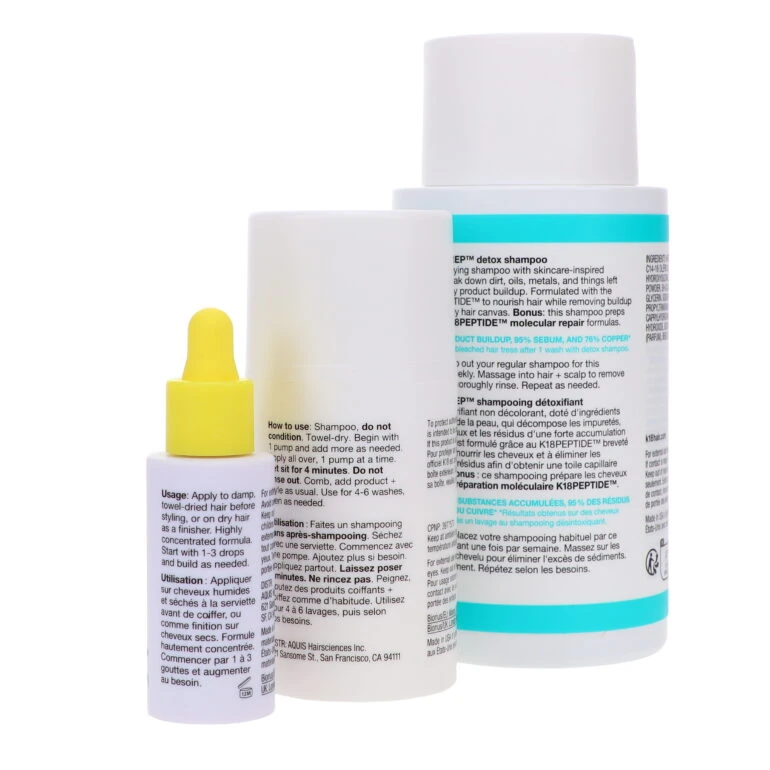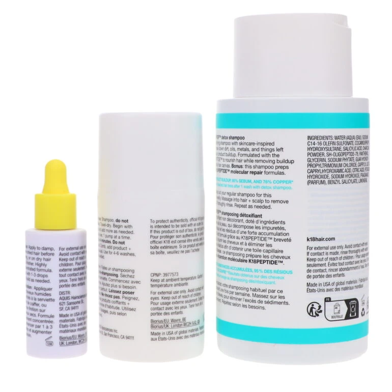 Begin with detox shampoo Massage detox shampoo into hair + scalp to remove excess buildup. Thoroughly rinse. Repeat as needed. Skip conditioner. Apply the leave-in molecular repair hair mask Towel-dry thoroughly. Apply 3-9 pumps of K18 leave-in molecular repair hair mask based on your length and density, starting at the ends and working up towards the roots. Let sit for 4 minutes. Do not rinse out. Finish with the molecular repair hair oil Apply 1-3 drops of molecular repair hair oil to damp hair, starting at the ends and working upward through the mid-lengths. Wait 4 minutes. Style as usual. Apply an additional 1-3 drops of molecular repair hair oil to dry hair as a finisher. A little goes a long way with our highly concentrated formulas. Start with the minimum recommended amount + build as needed.
