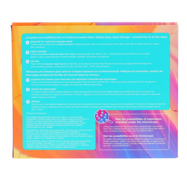 PEPTIDE PREP™ detox shampoo Water (Aqua) (Eau), Sodium C14-16 Olefin Sulfonate, Cocamidopropyl Hydroxysultaine, Salicylic Acid, Charcoal Powder, sh-Oligopeptide-78, Panthenol, Glycerin, Sodium Phytate, GuarHydroxypropyltrimonium Chloride, Caprylyl Glycol, Caprylhydroxamic Acid, Citric Acid, Potassium Hydroxide, Sodium Hydroxide, Fragrance (Parfum), Benzyl Salicylate, Limonene. leave-in molecular repair hair mask Water (Aqua) (Eau), Alcohol Denat., Propylene Glycol, Cetearyl Alcohol, Dicaprylyl Ether, Cetyl Esters, Behentrimonium Chloride, Polysorbate 20, sh-Oligopeptide-78 (K18PEPTIDE™), Hydrolyzed Wheat Protein, Hydrolyzed Wheat Starch, Isopropyl Alcohol, Tocopherol, Phenoxyethanol, Potassium Sorbate, Citric Acid, Fragrance (Parfum), Geraniol, Linalool, Hexyl Cinnamal, Benzyl Alcohol. molecular repair hair oil Caprylyl Caprylate/Caprate, Squalane, Persea Gratissima (Avocado) Oil, Helianthus Annuus (Sunflower) Oil, C13-15 Alkane, Undecane, Benzyl Alcohol, Tridecane, Castor Isostearate Succinate, Propanediol, sh-Oligopeptide-78, Fragrance (Parfum), Tocopherol, Cinnamal, Hexyl Cinnamal, Limonene, Linalool.